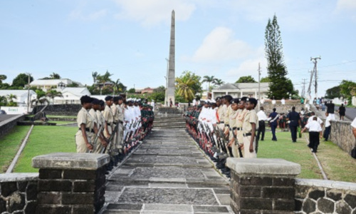 In 1955, following the end of the Second World War, it was moved and replaced by the grander structure and surroundings that can be seen today. The slim white obelisk displays two bronze plaques listing twenty men who died during World War One and six who were killed during World War Two. Three tombs lie in front of the obelisk. Each one is constructed from the stone of one of the three islands which comprised the colony of St. Kitts, Nevis and Anguilla. Every November, the Defence Force, the Police Force and various religious denominations gather at the memorial to remember Kittitians, Nevisians and Anguillians who died in service during the two world wars.